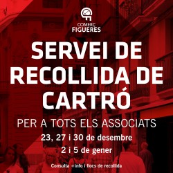 Comerç Figueres Associació oferirà als establiments associats un servei de recollida de cartró, doncs l'entitat vol que la ciutat i el comerç puguin seguir endavant amb la màxima normalitat en unes dates tan senyalades i per això oferirà a tots els seus associats un servei de recollida del cartró més enllà dels serveis mínims previstos.