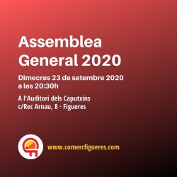 El Sr. Frederic Carbó Pujol, president de Comerç Figueres Associació, convoca a tots els socis a l’Assemblea General que es durà a terme el dimecres 23 de setembre de 2020 a les 20:30h a l’Auditori dels Caputxins (c/Rec Arnau, 8) amb el següent ordre del dia: